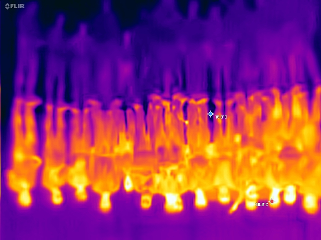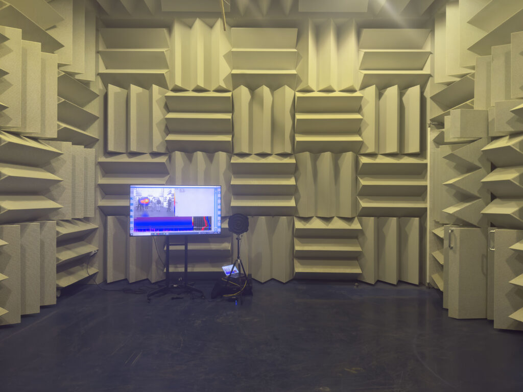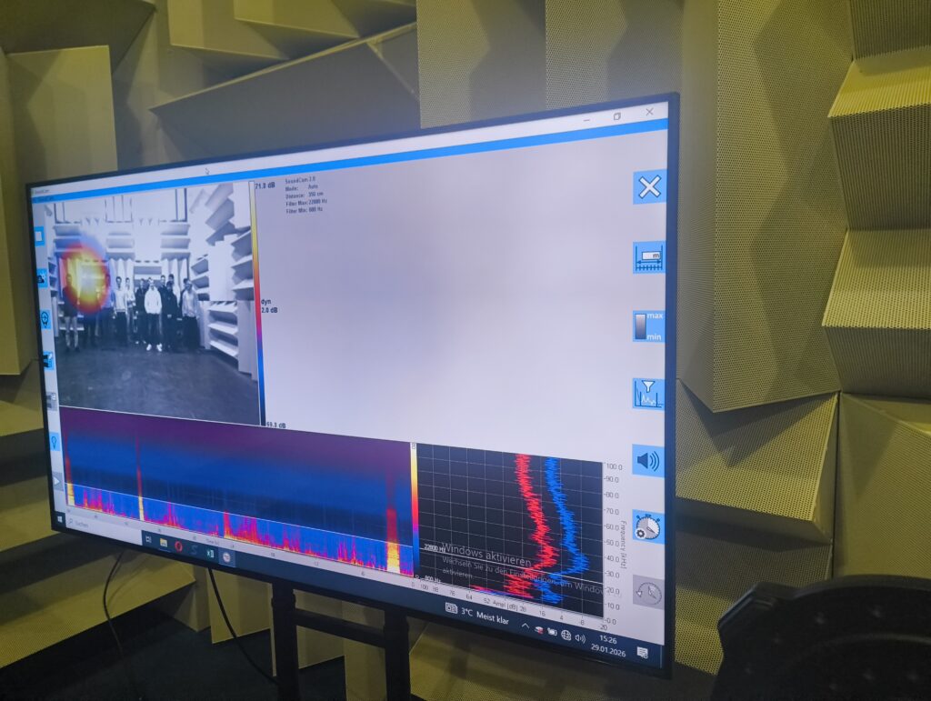 Besonders beeindruckend war eine sogenannte „Schallkamera“, die mit einem Laptop und Fernseher verbunden war. Sie zeigte auf dem Bildschirm, ähnlich wie eine Wärmebildkamera, die genaue Quelle jedes Geräusches im Sichtfeld. Bei absoluter Stille wurde eine Lautstärke von etwa –10 dB gemessen. Uns wurde erklärt, dass diese Räume für präzise Lautstärkemessungen unterschiedlichster Produkte verwendet werden, von Haushaltsgeräten bis hin zu Lüftungssystemen.