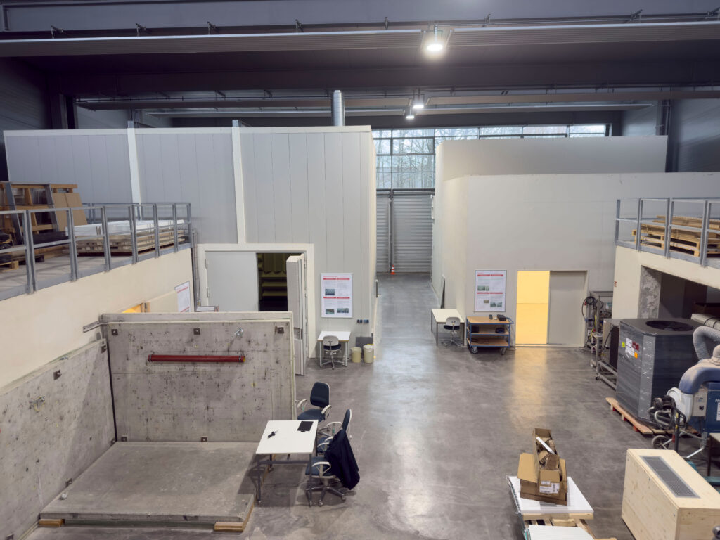 Anschließend wurden wir in eine große Halle geführt, in der ein Versuchsaufbau zur Messung von Körperschall in Bauwerken zu sehen war. Dabei wurden Beispiele wie die Geräuschentwicklung eines Whirlpool-Kompressors oder die Resonanz von Wasserleitungen erklärt. Außerdem besichtigten wir einen Raum, in dem Trittschall auf verschiedenen Bodenbelägen getestet werden kann. Als der Guide das Trittschallgerät einschaltete, hörte man deutlich das laute Hämmern, das durch die Holzböden übertragen wurde.