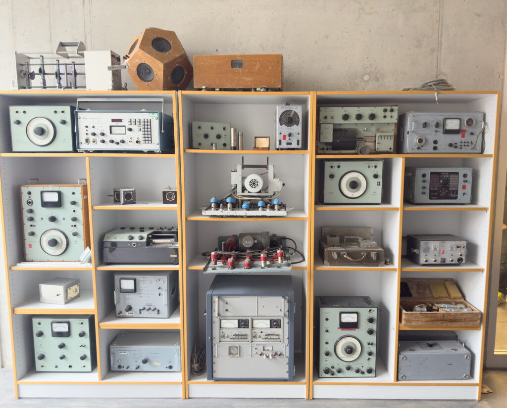 Anschließend besuchten wir den „schalltoten Raum“. Dieser war an Wänden und Decke vollständig mit Absorberkeilen ausgestattet. Er verfügte über zwei hintereinanderliegende Türen mit einer Gesamtdicke von etwa 1,5 Metern. Das Sprechen in diesem Raum fühlte sich ungewohnt an – als wäre man fast taub, ähnlich dem Moment, wenn man einen lauten Club verlässt.