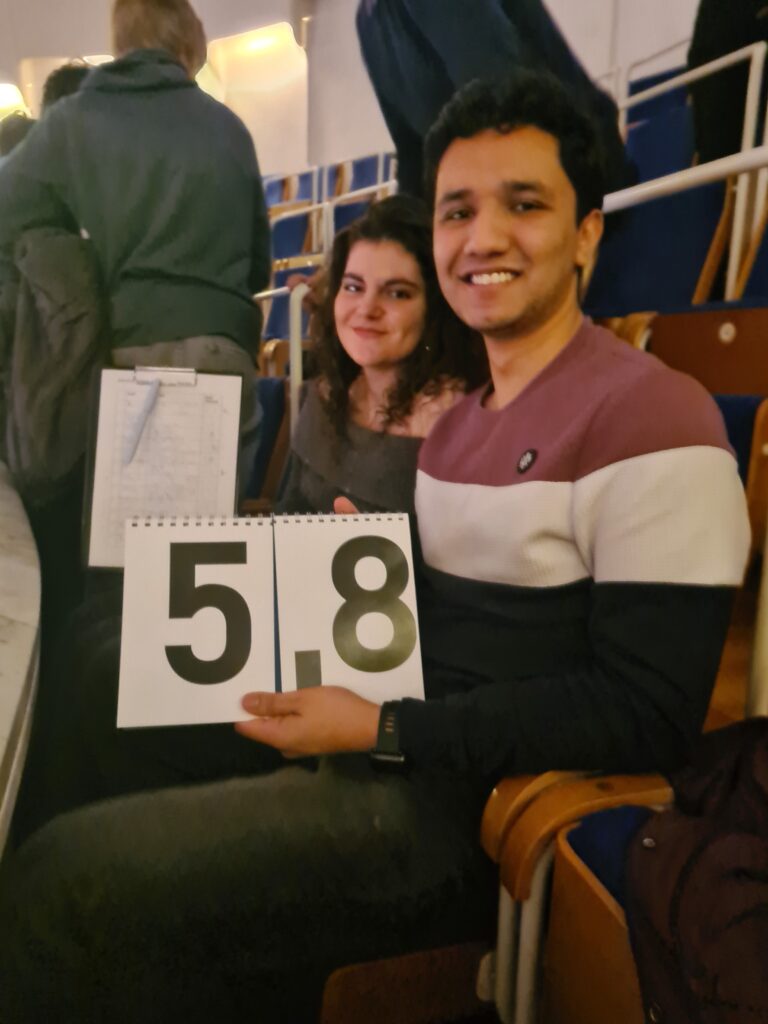 Die Bewertung übernahm eine Jury aus dem Publikum. Fünf ausgewählte Personen vergaben Punkte von 1 bis 10. Ein Schüler aus dem Kurs meldete sich freiwillig als Jurymitglied. Das erforderte durchaus Mut – nicht nur, weil es für fast alle der erste Poetry Slam war, sondern auch, weil die eigene Wertung sichtbar Teil des Gesamturteils des Publikums wurde. Nach vielen überragenden und auch einigen kritischen Bewertungen konnte am Ende des Abends das „lebendige“ Team den Tagessieg holen. Das gemeinsame Fazit des Abends war allerdings, dass tatsächlich alle Beiträge „alive“ waren, manche überraschend aktuell und alle absolut zeitlos.