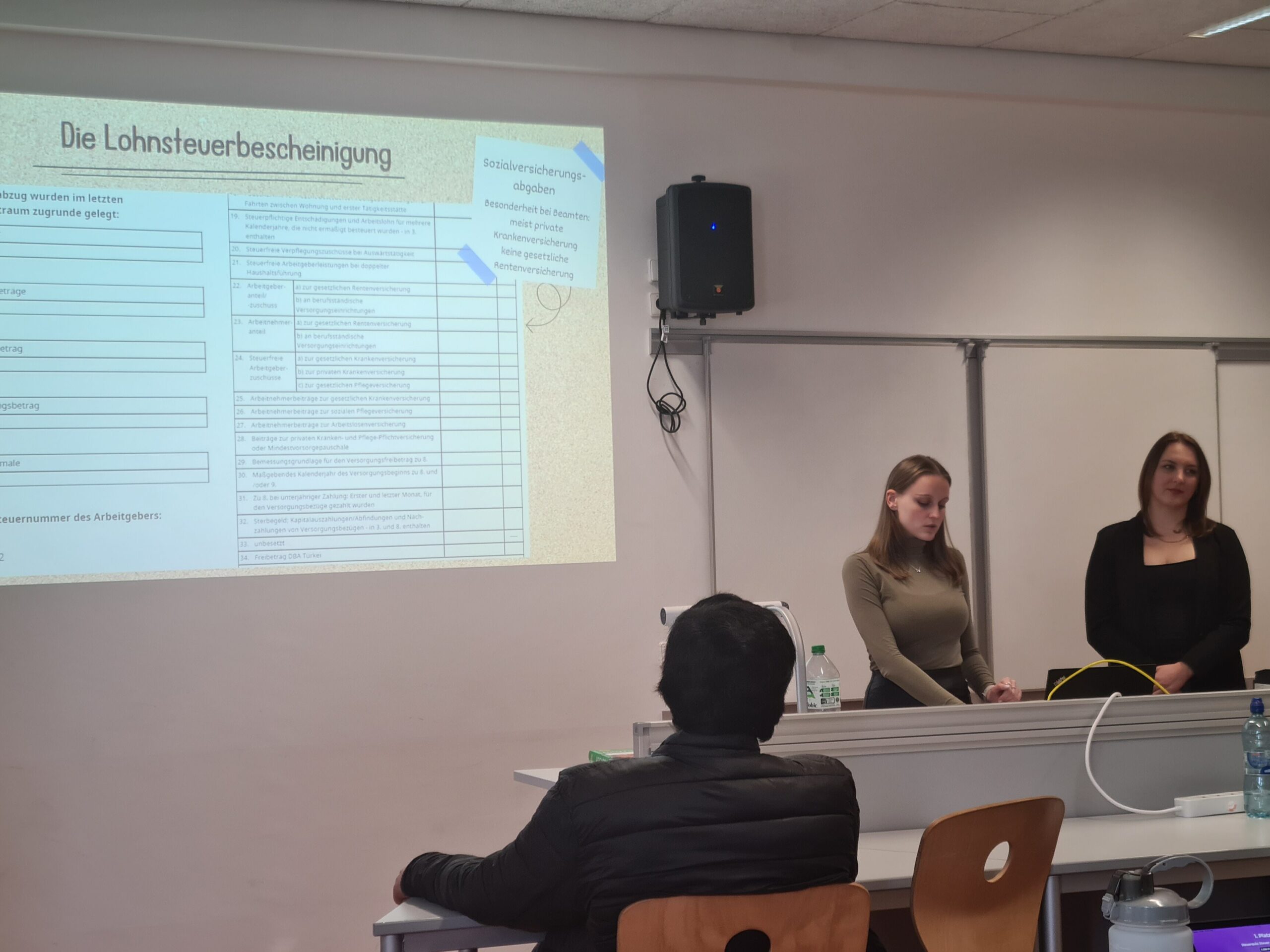 Besonders praxisnah wurde es beim Thema Steuererklärung. Die Schülerinnen und Schüler durften einen Teil einer Steuererklärung selbst ausfüllen und erhielten so einen ersten konkreten Eindruck davon, welche Angaben notwendig sind und was es bedeutet, sich mit den eigenen steuerlichen Pflichten auseinanderzusetzen.